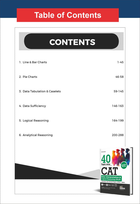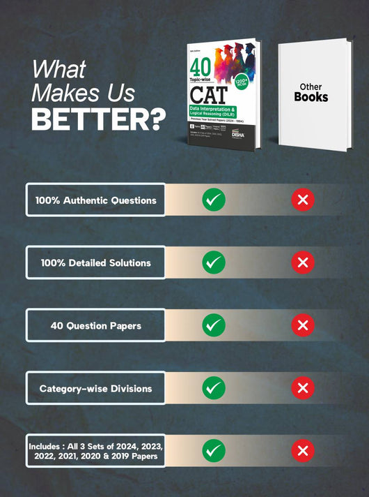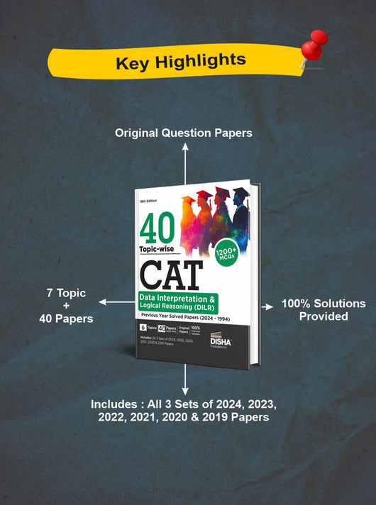 The latest 18th edition, 40 Topic-wise CAT Data Interpretation & Logical Reasoning (DILR) Previous Year Solved Papers (2024 - 1994) consists of past years solved papers of CAT from 1994 to 2024.