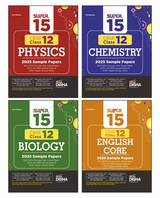 Disha Combo of Super 15 CBSE Class 12 Physics, Chemistry, Biology & English Core 2025 Sample Papers | 2024 Solved Papers | Topper Answer Sheet 3rd Edition | Solutions with marking scheme |