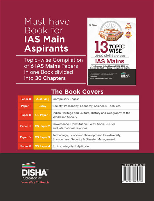 The updated 7th Edition of the book 13 Topic-Wise UPSC Civil Services IAS Mains Previous Year Solved Papers (2025 to 2013) consists of solutions to 13 IAS Mains Original Papers – Qualifying Paper 1 (Compulsory English), Paper I (Essay), & Paper II - V (General Studies Papers 1 to 4) in Topic-wise format.