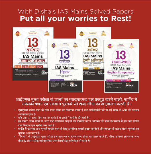 he thoroughly updated 7th Edition of the Combo (set of 4 Books) - Disha's 13 Varshvaar UPSC Civil Services IAS Mains Previous Year Solved Papers (2013 - 2025) consists of Past 13 years solved papers of all the 7 Compulsory Papers – Qualifying Paper 1 (Compulsory English); Qualifying Paper 2 (Hindi Anivarya Hindi); Paper I (Nibandh); Papers II to V (Samanya Adhyayan Papers 1 to 4).