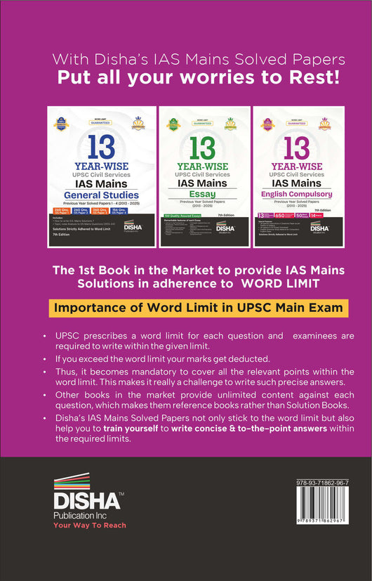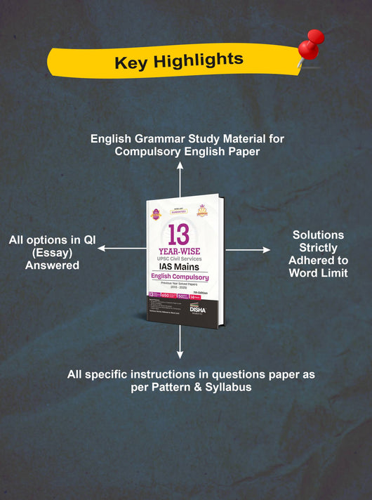 The updated 7th Edition of 13 Year-wise UPSC Civil Services IAS Mains English (Compulsory) Solved Papers (2013 - 2025) consists of Past 13 years Solved Papers of the English (Compulsory) Paper in Year-wise Format.