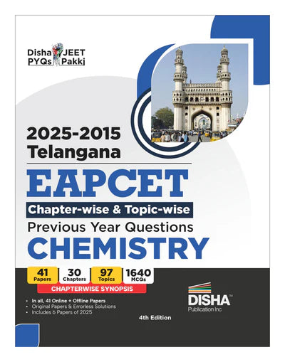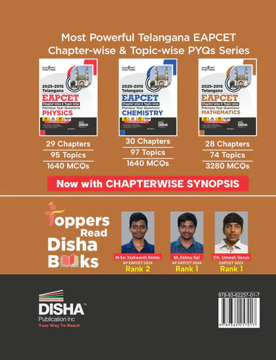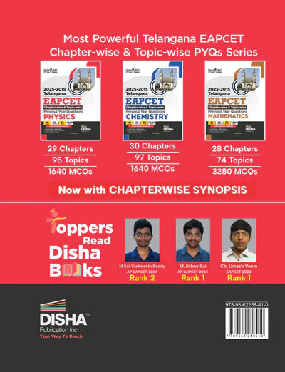 The latest 4th Edition of Disha's Bestseller Combo (set of 3 Books) 2025 - 2015 Telangana EAPCET Chapter-wise & Topic-wise Previous Year Solved Papers provides the latest 11 years all Shifts (Since the formation of State) Solutions of Physics, Chemistry & Mathematics Questions distributed into Chapters & Topics.