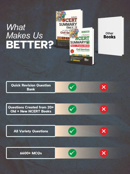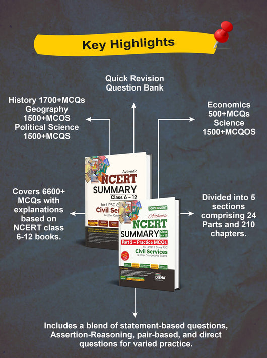 • These Books will help to reinforce understanding with focused summaries and key takeaways, making complex ideas easier to grasp.NCERT Summary by Disha is India's 1st Book to capture Authentic Summary of Old & New NCERT Class 6 to 12 Books of all the General Studies Subjects.