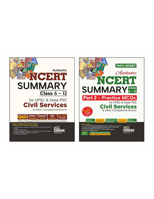Disha Combo (2 Books) Authentic NCERT Summary (Class 6 to 12) Part 1 & 2 - One Liner Concepts & Practice MCQs for UPSC & State PSC Civil Services & other Exams | Old & New NCERT General Studies