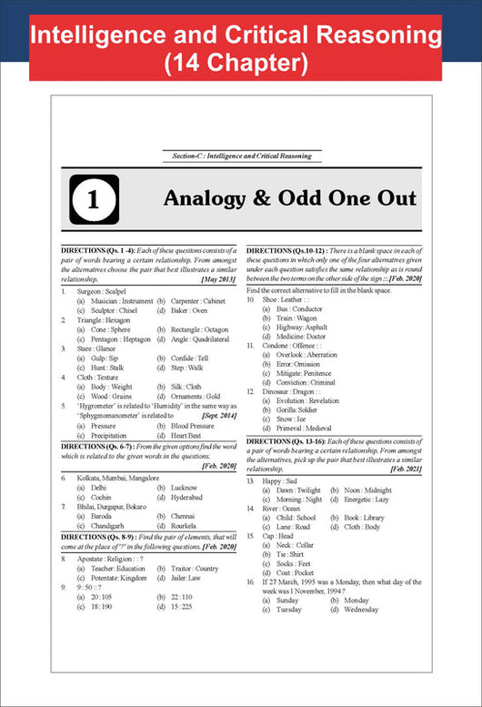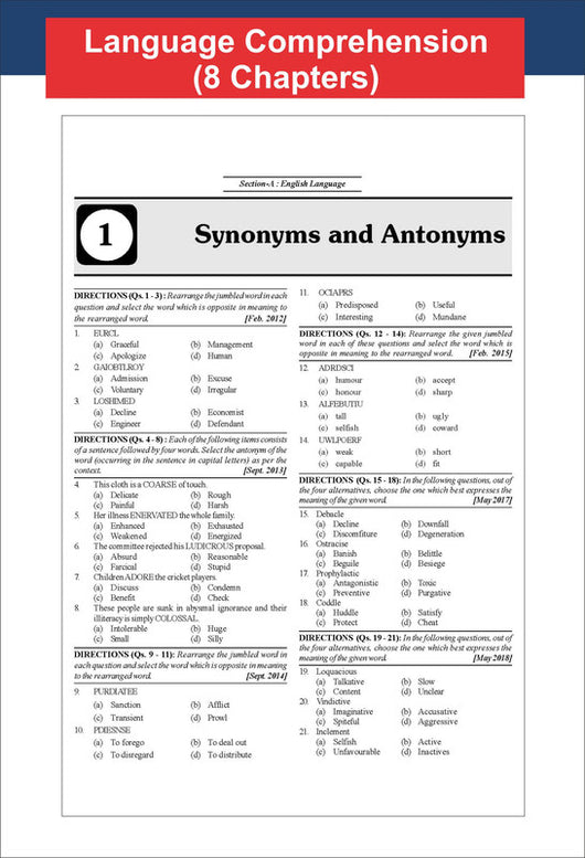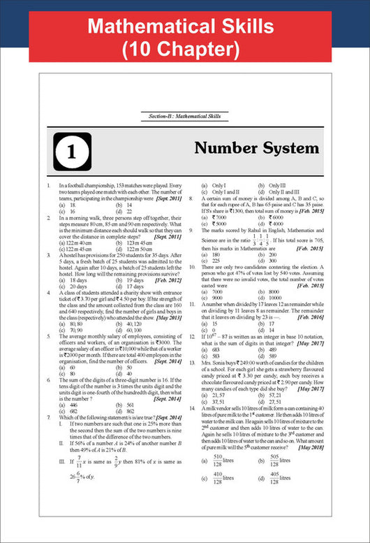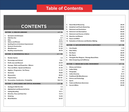 ✍ The book is divided into 5 sections i. MATHEMATICAL SKILLS, ii. LANGUAGE COMPREHENSION, iii. DATA ANALYSIS AND SUFFICIENCY, iv. INTELLIGENCE AND CRITICAL REASONING and v. INDIAN AND GLOBAL ENVIRONMENT.